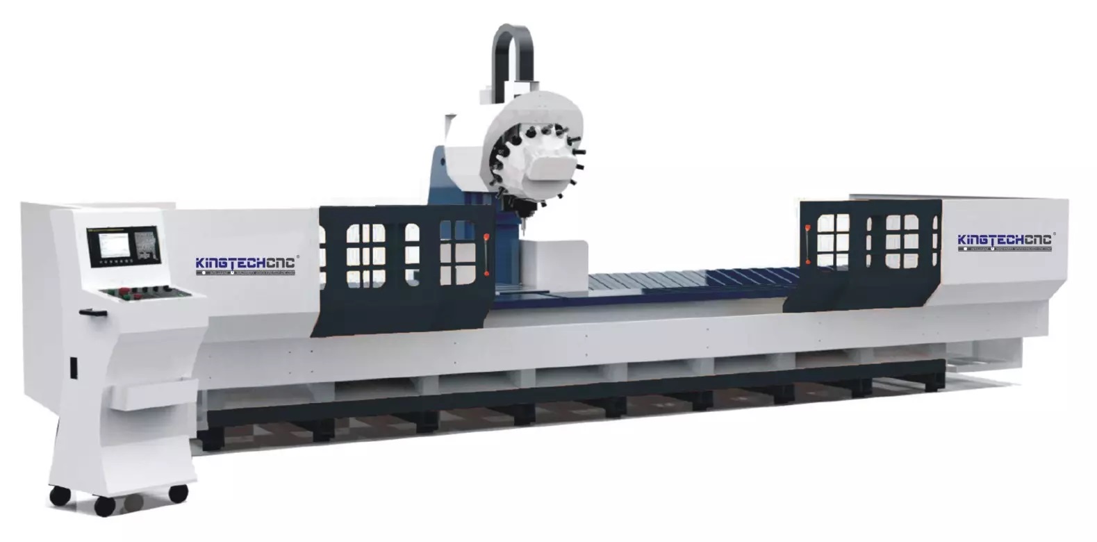 KINGTECH 44 Series Turret Type Machining Center is an automatic profile machining center integrating milling, drilling, tapping and chamfering. It adopts turret spindle, which is suitable for mass production and processing of various lengths of profile products. The ideal equipment for machine aluminum frame processing!