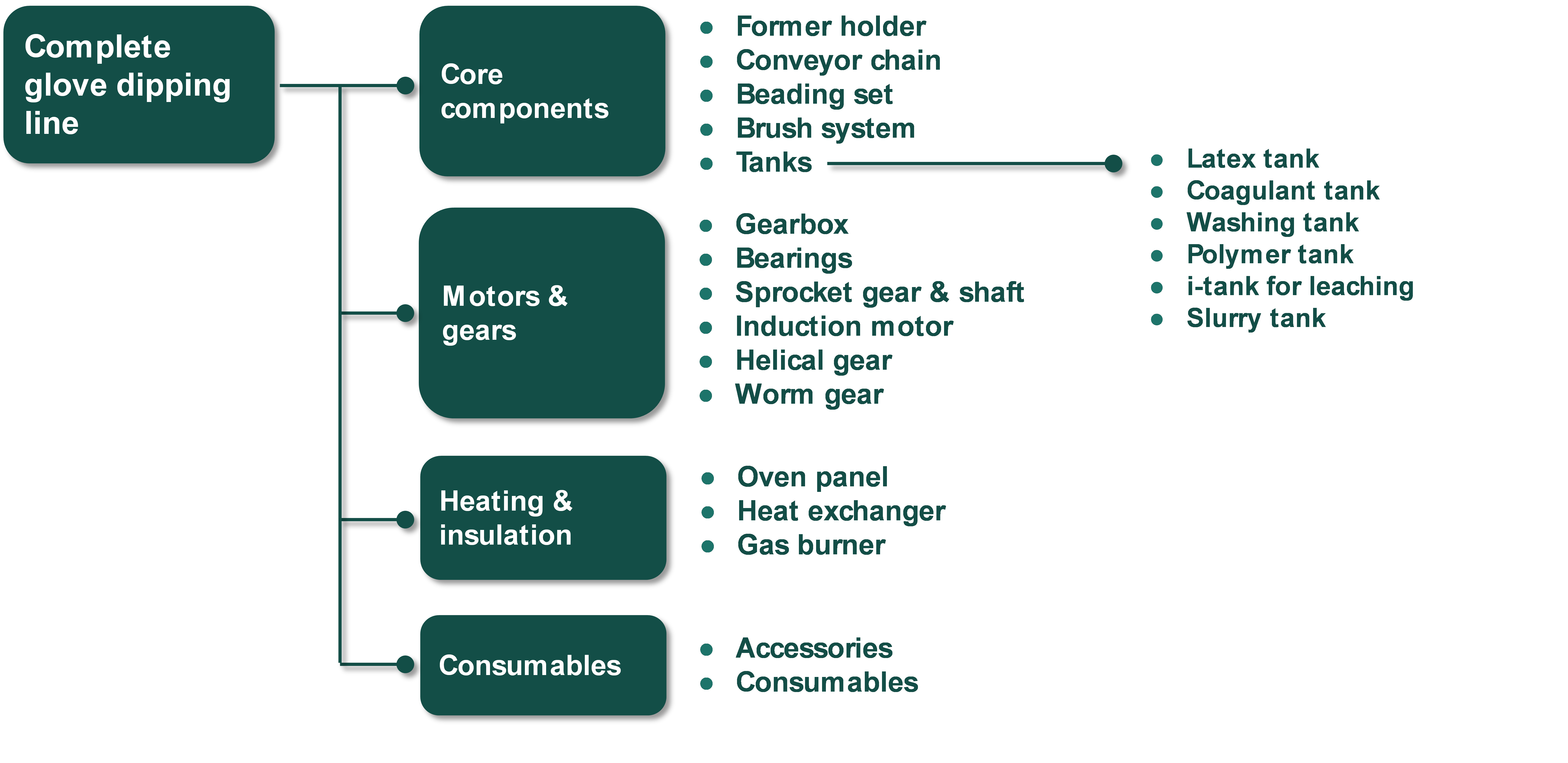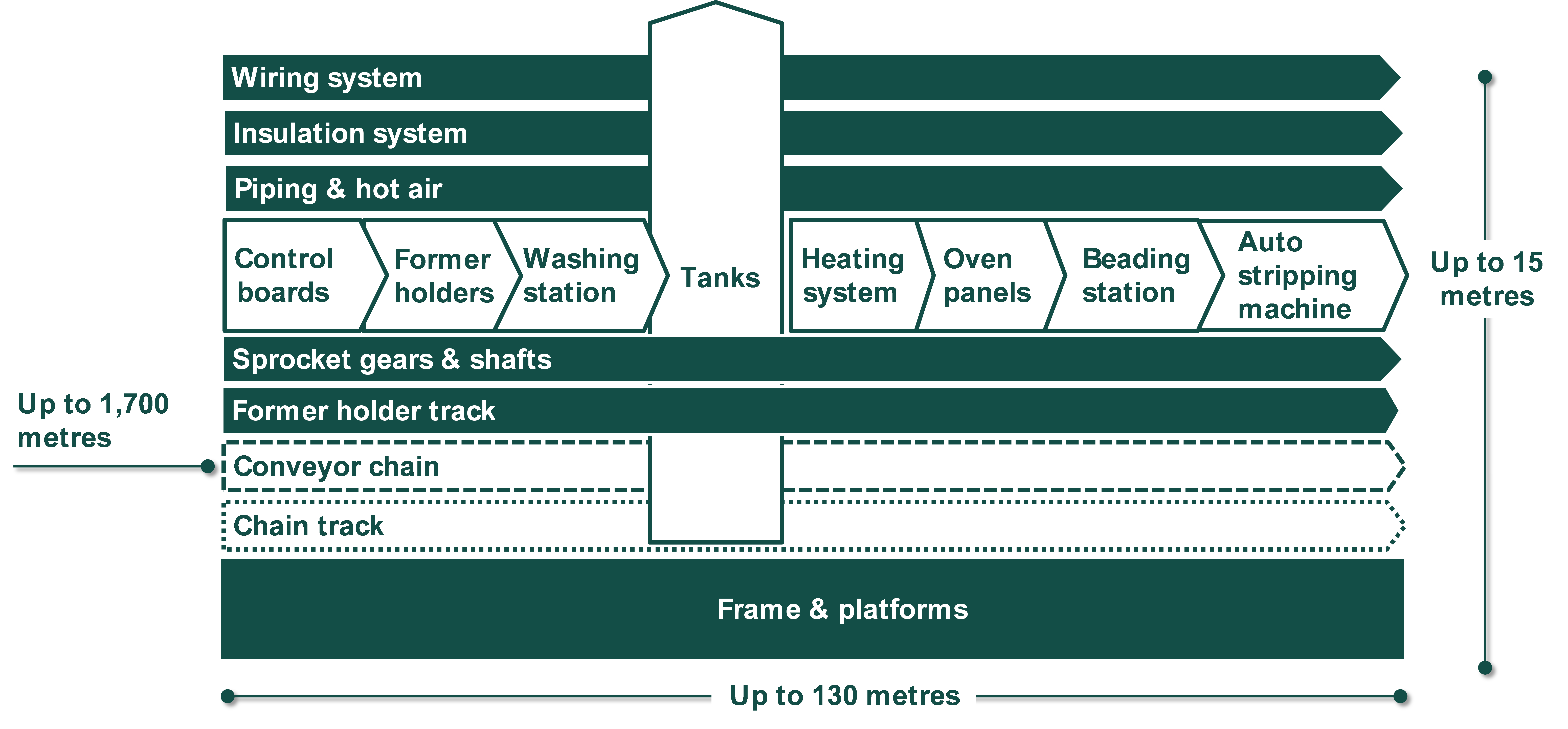 We can also supply and/or modify individual sub-systems within your dipping line, down to the smallest component. The illustration provides a visualisation of a dipping line's core components, sub-systems and examples of components within a sub-system.