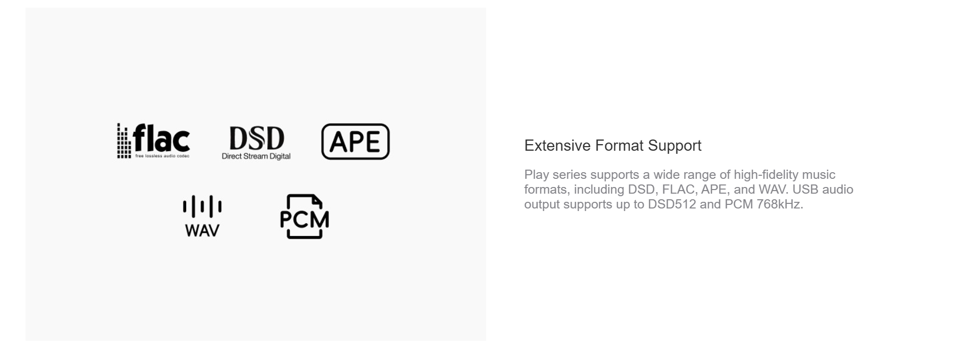 DSD (DSF, DFF, SACD ISO) Support DST up to DSD512, MP3, APE, WAV, FLAC, AIF, AIFF, AAC, NRG, CUE