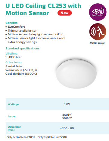PHILIPS U LED CEILING CL253 WITH MOTION SENSOR CL253 EC RD 12W 27K 65K W HV SR 02 929002215907 929002216107 [WARM WHITE / COOL DAYLIGHT]