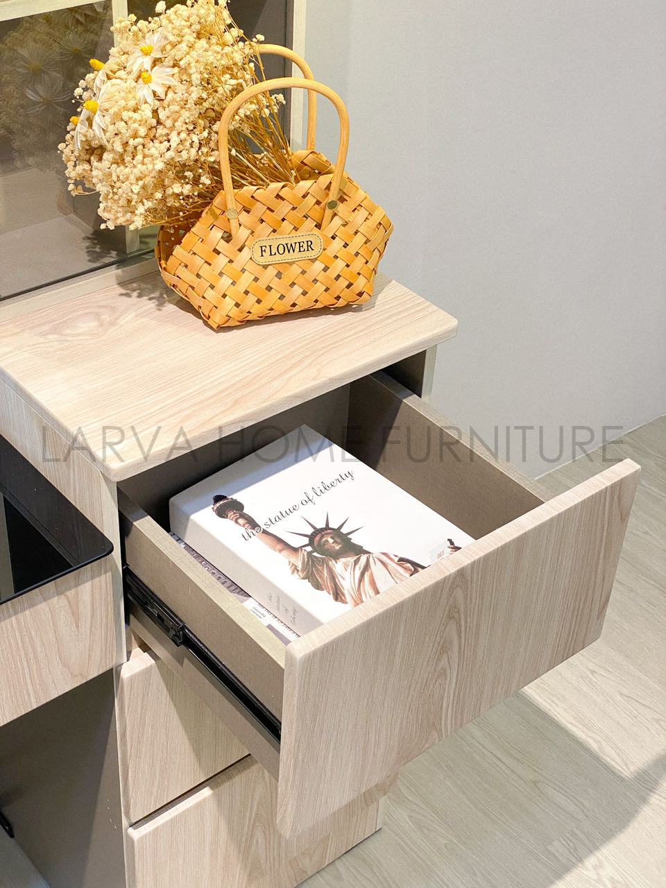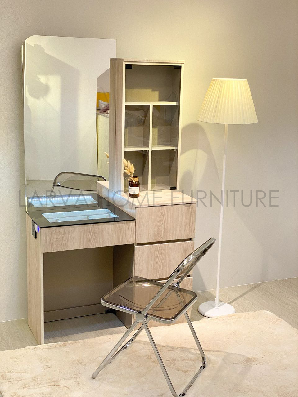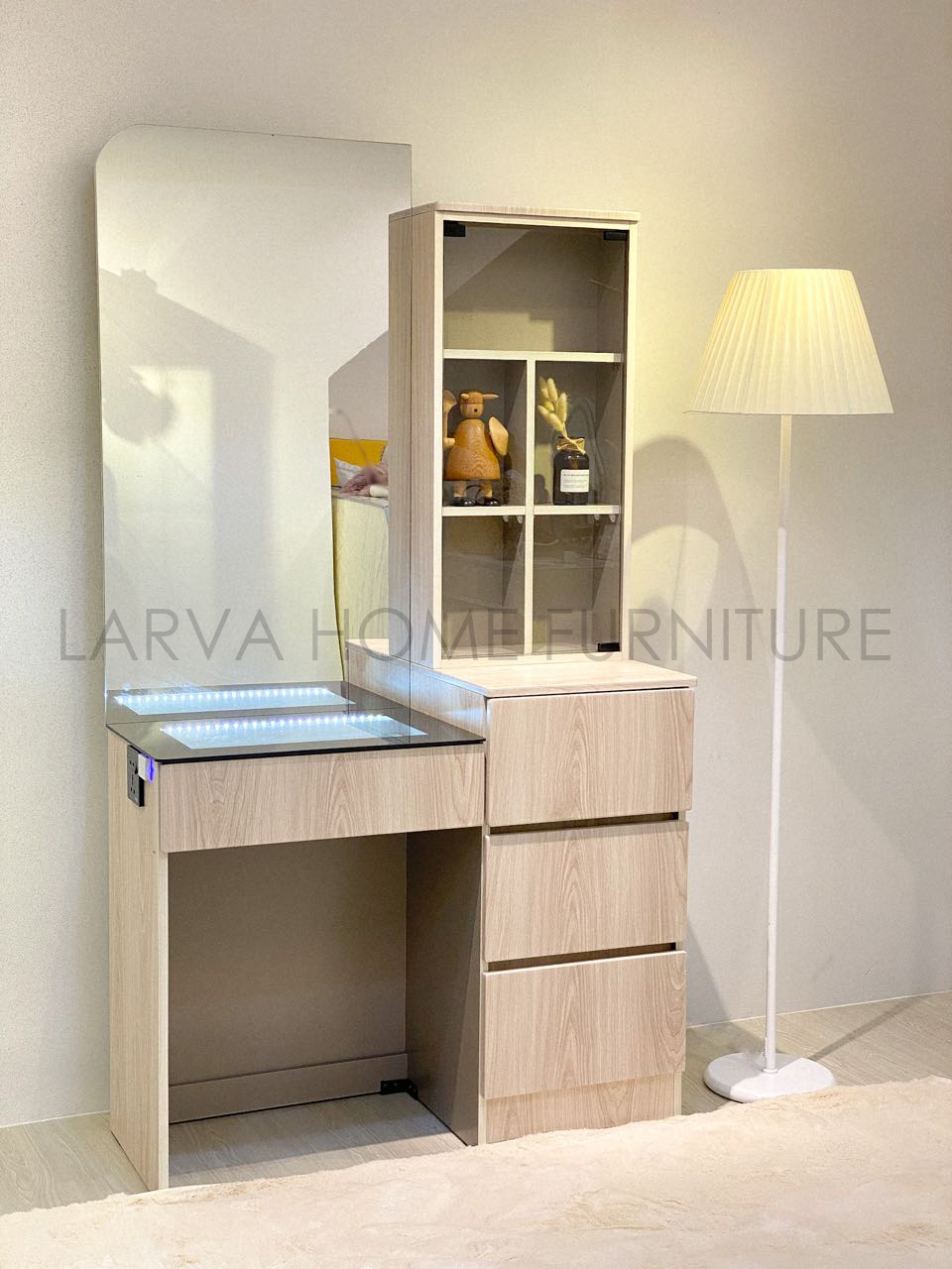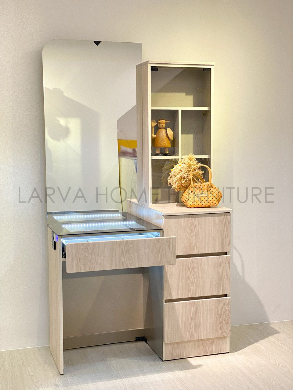 Molla LED Dressing Table it's enough space for makeup & keep your personal belongings. With a display cabinet on the side that makes this dresser different than others. If you like unique Molla LED Dressing Table is one of it's kind.