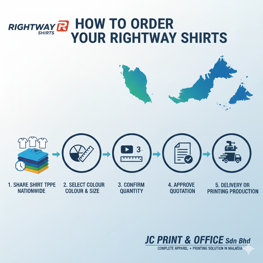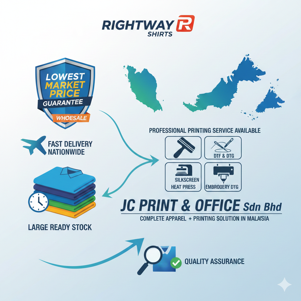 When it comes to affordable, premium, and printing-friendly apparel in Malaysia, Rightway shirts are a clear favourite. With JC Print & Office Sdn Bhd, customers not only receive the best pricing, but also professional service, ready stock, and top-quality printing.