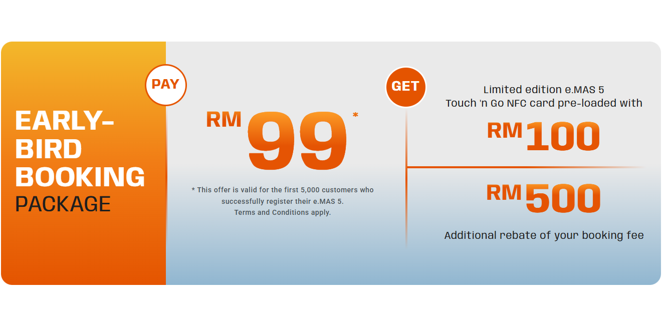 To make the deal even sweeter, bookings start from only RM99. Each successful booking comes with a limited-edition Proton e.MAS Touch ‘n Go NFC card preloaded with RM100, while the first 5,000 customers who register their cars will enjoy a RM500 rebate on the booking fee. Malaysians can view the e.MAS 5 at Proton showrooms nationwide starting October 17.