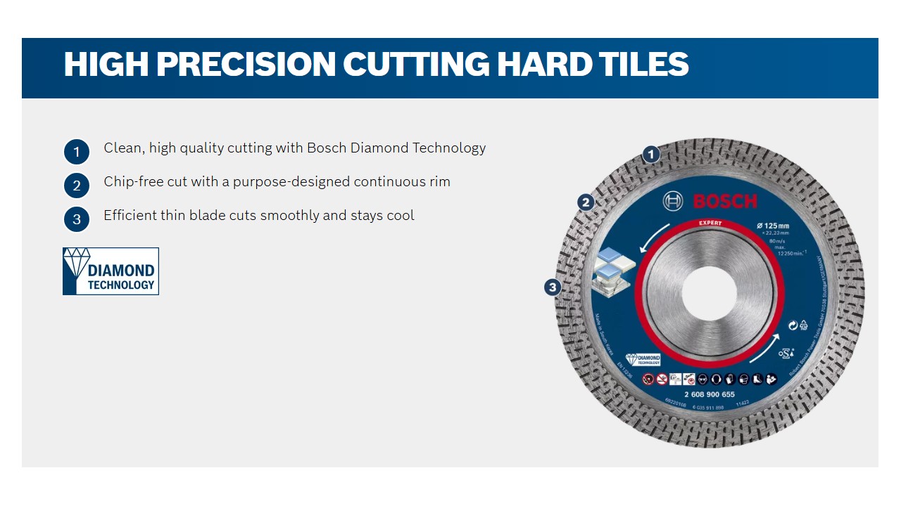 The Bosch EXPERT HardCeramic 76mm Diamond Tile-Cutting Disc offers the best cut in hard tiles. You can be confident of achieving a professional finish on every job with this diamond cutting disc.