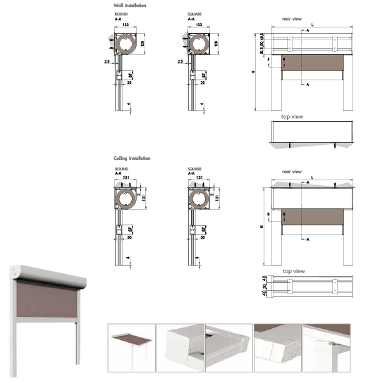 130 mm cassette awning available in versions Square and Round with ZIP guide system and self-standing cassette. Suitable for both niche and wall installation of fixtures; fast and easy to install and inspect. The guide is composed by two profiles: support and cover; developed both for manual and motorized systems.