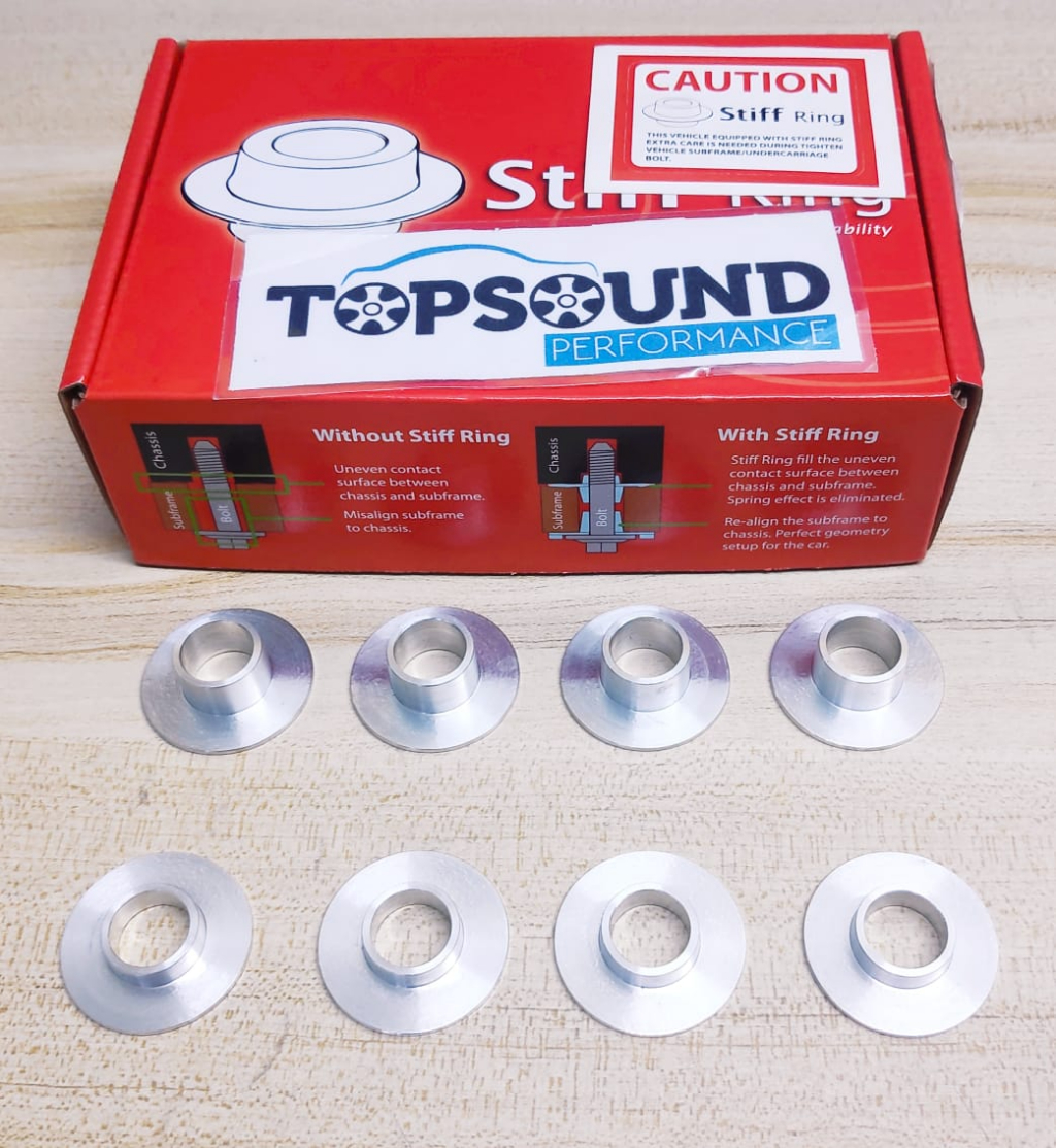 With the Stiff Ring in proper place, the gap is filled up to stop the movement of the sub frame and the car body forever and provide ideal alignment between both, as a result of a perfect geometry setup. Uneven surface is filled up by Stiff Ring, thus, spring effect is remove and resulting a comfortable cabin even further improved the car stability.
