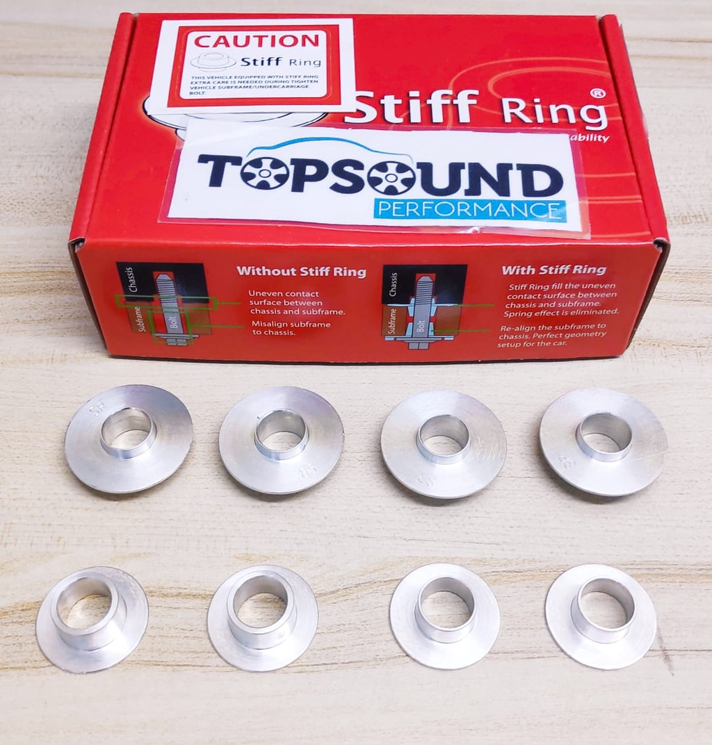 With the Stiff Ring in proper place, the gap is filled up to stop the movement of the sub frame and the car body forever and provide ideal alignment between both, as a result of a perfect geometry setup. Uneven surface is filled up by Stiff Ring, thus, spring effect is remove and resulting a comfortable cabin even further improved the car stability.