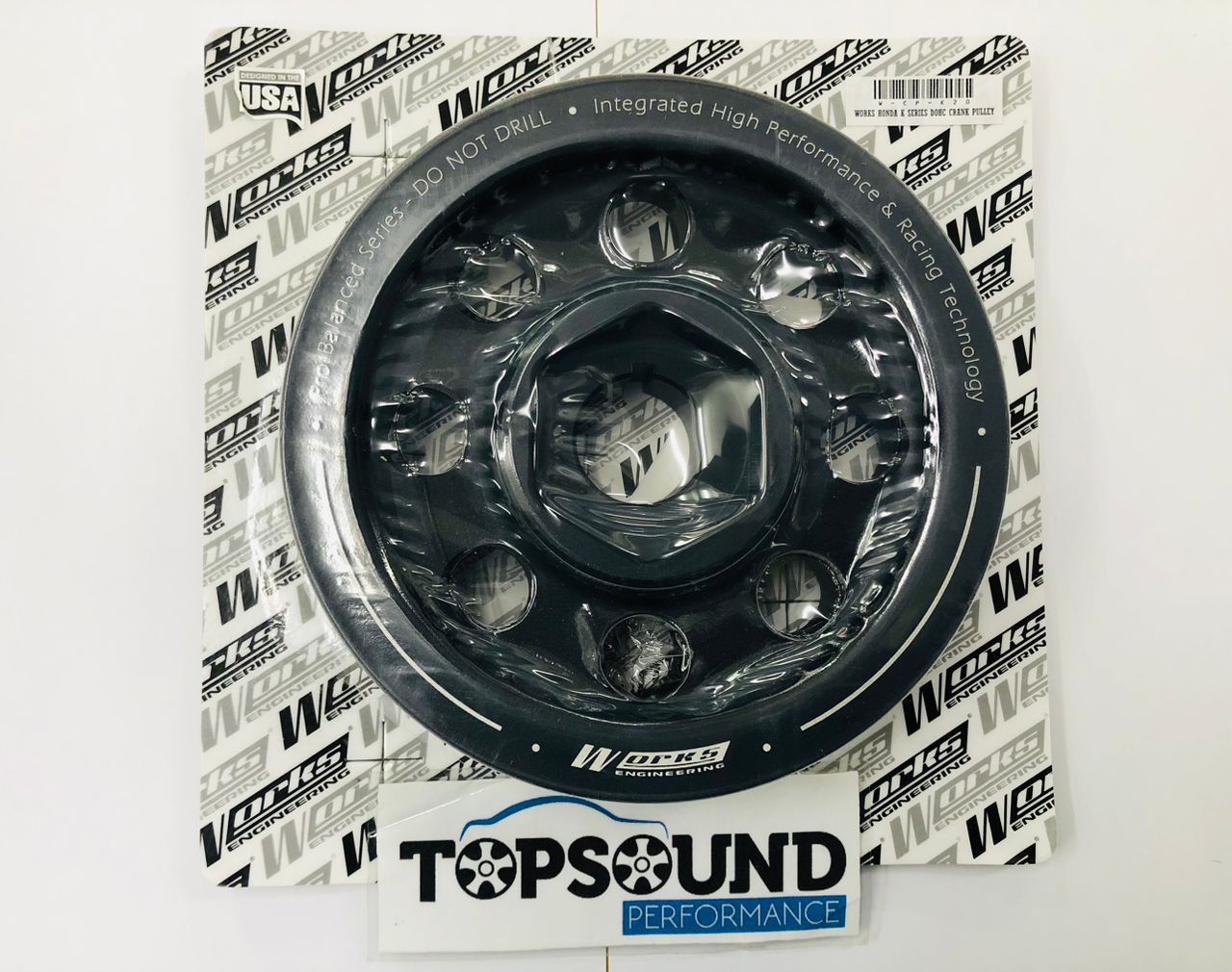 Weight reduction is how we are able to increase horsepower. Each pound of weight removed from the crankshaft is worth approximately 2.7HP, and our stock diameter crank pulleys are at least 60% lighter than the OEM pulleys they replace, our undersize crank pulley could be up to 90% lighter than the OEM pulleys. This weight loss provides even more spectacular gains than force induction, nitrous, VTEC and increased RPM’s. With our undersize crank pulley, we still fully maintain all accessory output minimums like air conditioning efficiency, power steering feel, and voltage even at idle with everything electrical on in the car. There are no adverse effects from using any of our pulley versions. Bolt them on and forget about them, then just follow your vehicles normal maintenance schedule. Works Engineering crank pulleys are precisioned CNC with the highest grade light weight forged aluminium. Our Pro Balancing series are black oxide coated and hardened for even more strength, you will never have to worry about unbalance or breakage due to material fatigue