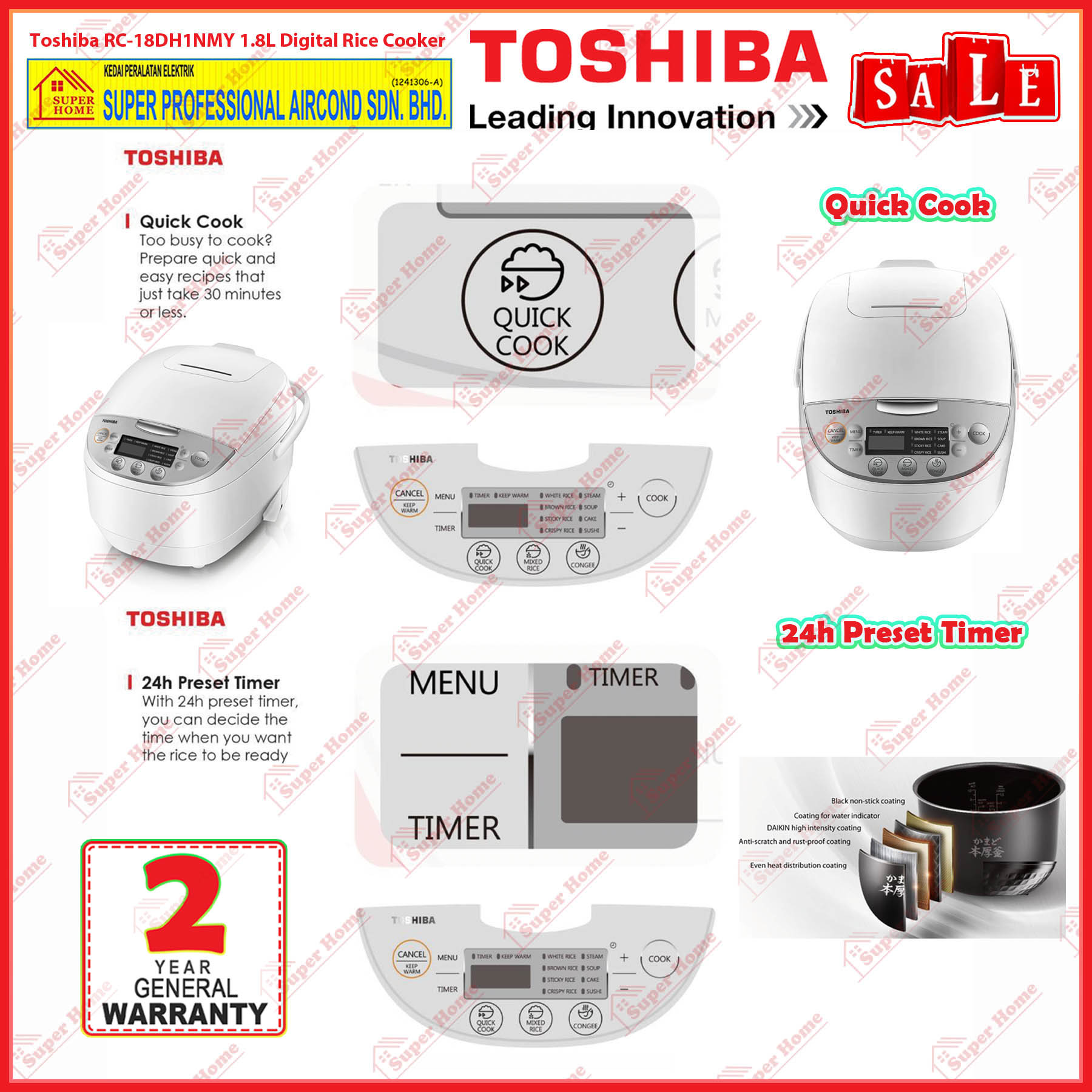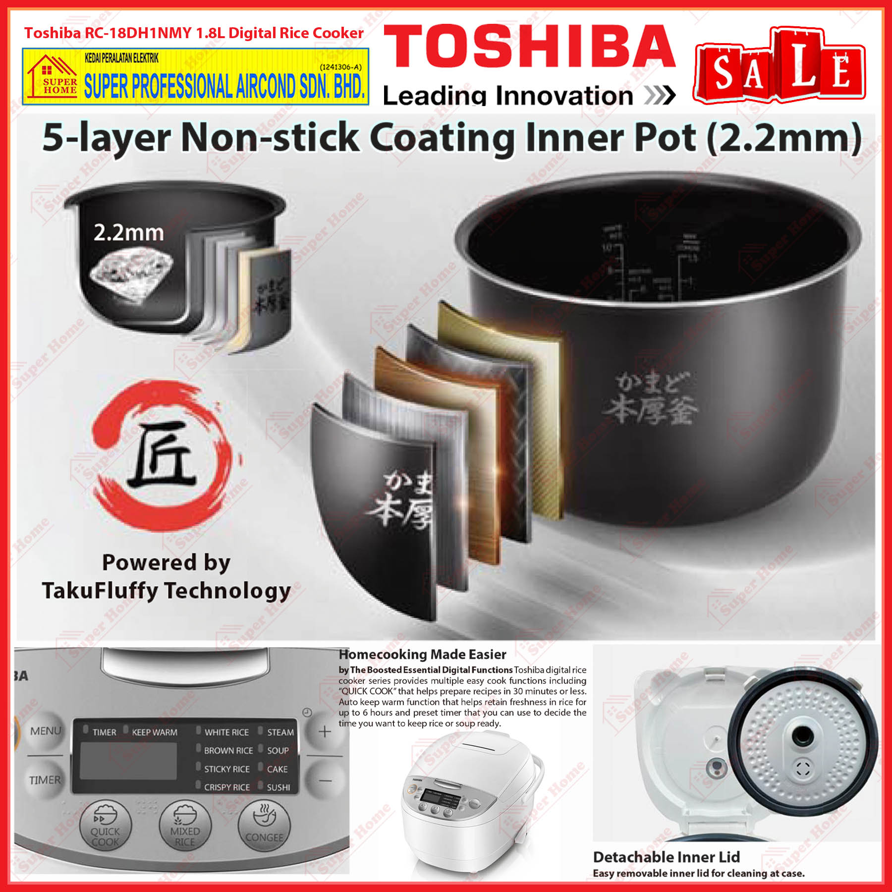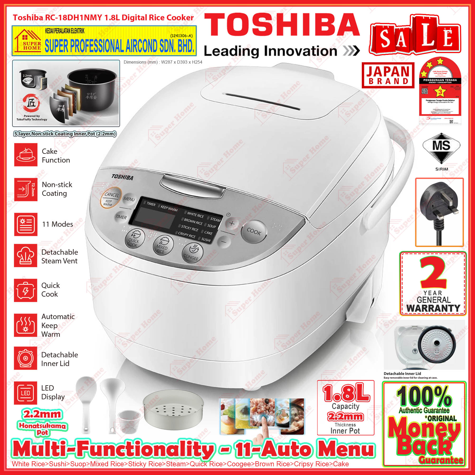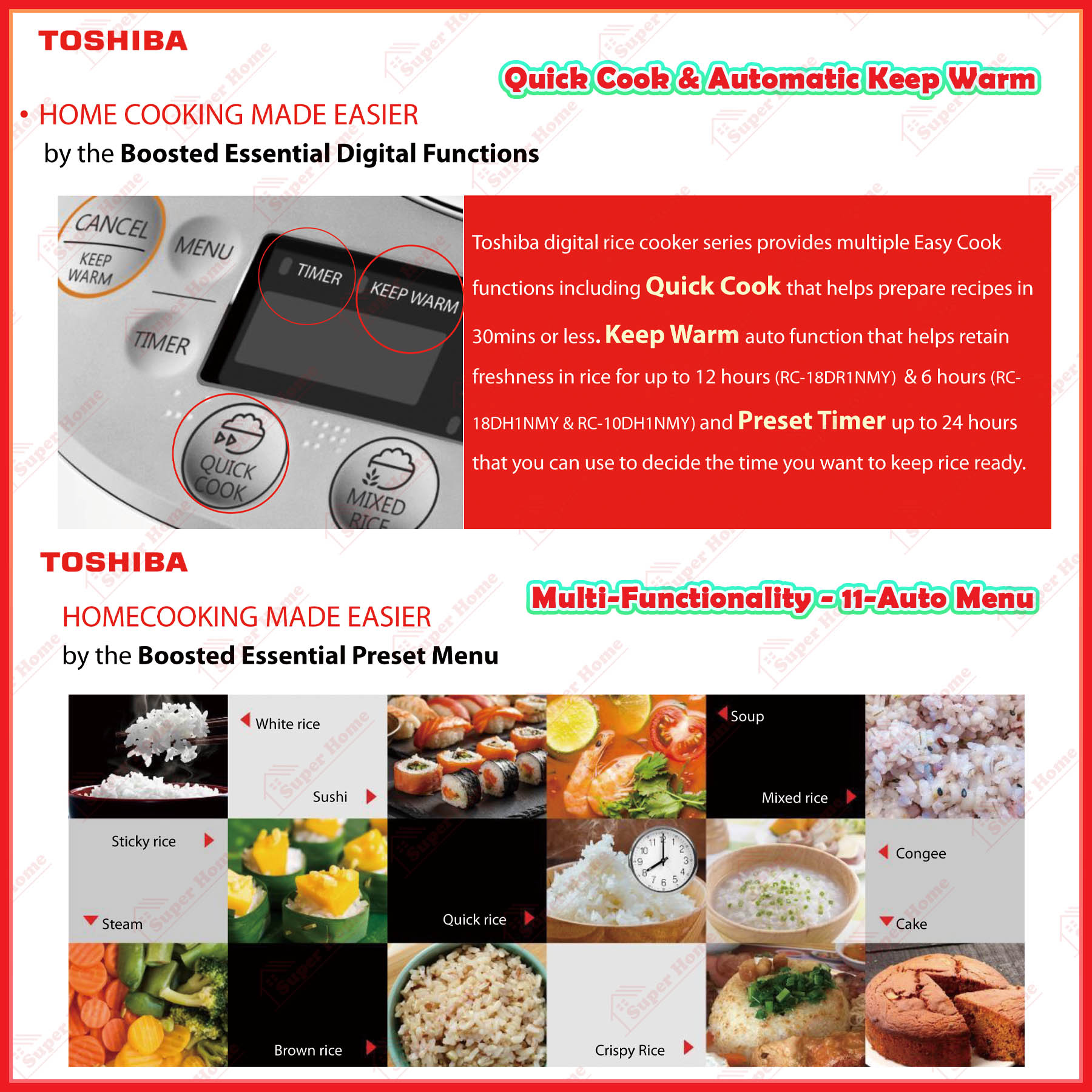 Function: QUICK COOK, MIXED RICE, CONGEE, WHITE RICE, BROWN RICE, STICKY RICE, CRISPY RICE, SOUP, CAKE, SUSHI, STEAM