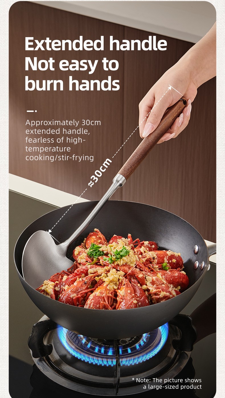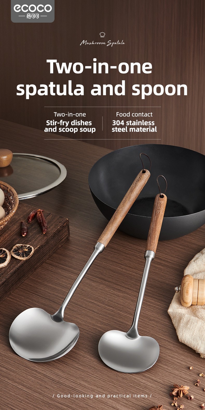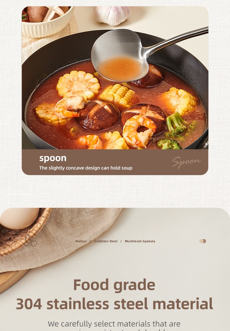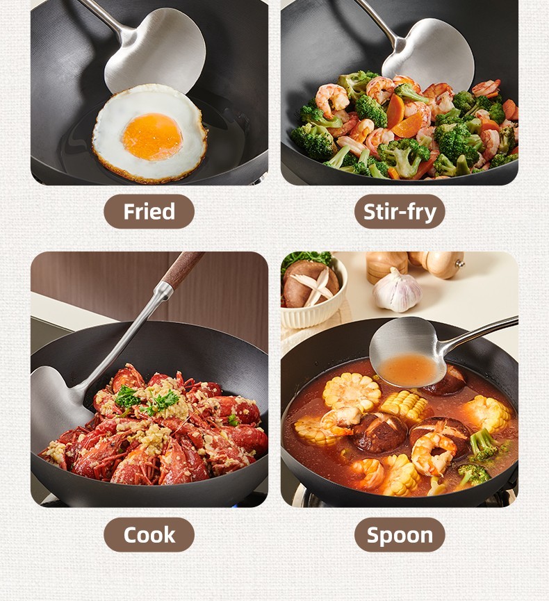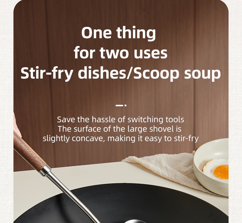2-in-1 Design Includes mushroom-style wide spatula for stir-frying + slightly concave ladle for soup.