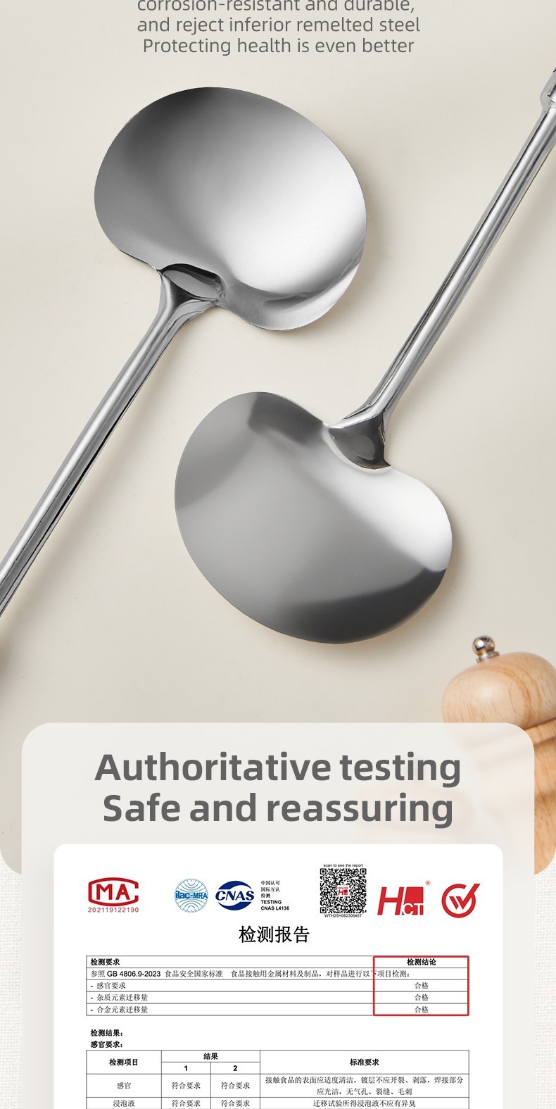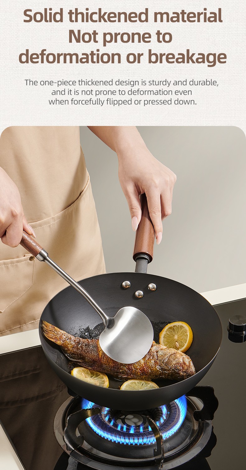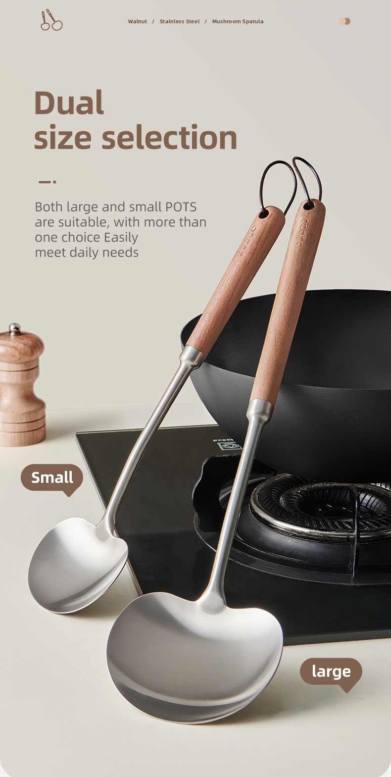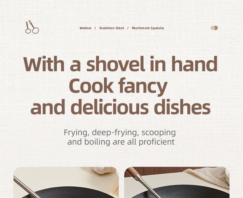 2-in-1 Design Includes mushroom-style wide spatula for stir-frying + slightly concave ladle for soup.