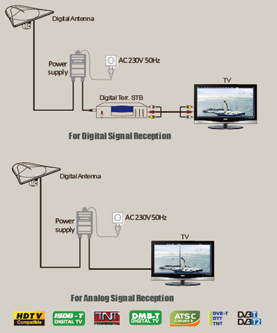 - Power Supply: DC 12V 50mA input for antenna AC230V 50Hz input for power supply unit