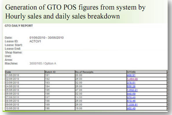 - Generates GTO POS figures from the system (e.g. Hourly and Daily Sales Breakdown)