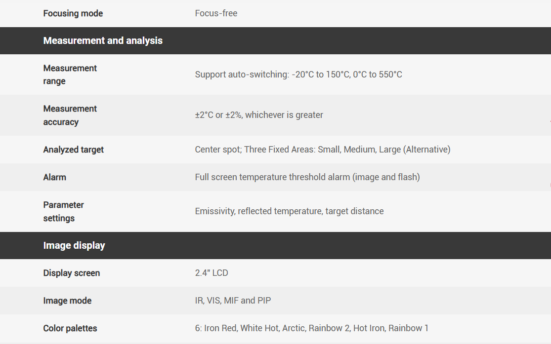 Equipped with a thermal imaging sensor and visible light camera, EasIR Series provides 4 image modes and 6 color palettes, helping users to observe and analyze the heat distribution of targets more intuitively.