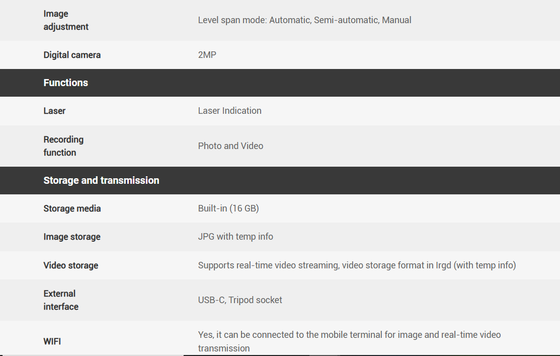 EasIR Series tool-like thermal camera provides two configuration options of 120x90 and 256x192 IR detectors. It adopts the new real-time IR-Perfclear technology to enhance the details and reduce noise of the image and present a clearer image in real time. Equipped with a series of professional functions such as 2MP visible light camera, video streaming and recording, WIFI, and OTA upgrade, etc., EasIR Series brings a clearer, more powerful and smoother work experience for users.