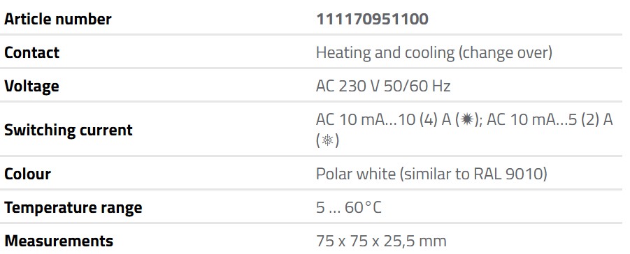 Temperature range: +5.0 to +60 °C. Contact: 1 CO. Switching current: AC 10 mA to 10 A heating, DC 30 W, 10 mA to 5.0 A cooling. Hysteresis: approx. 0.5 K.
