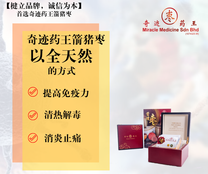 同时奇迹药王箭猪枣能够帮助您以天然的方式提高身体的免疫能力,从小孩到老年人,都能够以零副作用的方法,让自己的身体免受病毒的袭击。