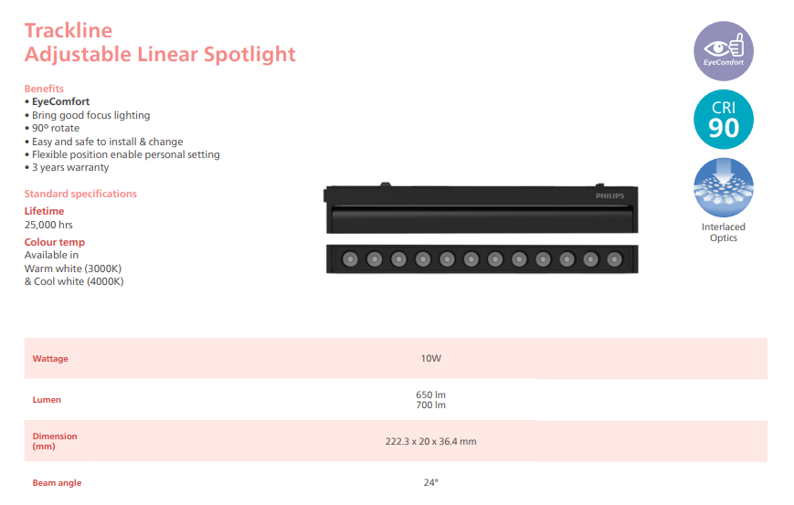 Illuminate your space with precision and elegance using the (NEW) PHILIPS SLIM TRACKLINE ADJUSTABLE LINEAR SPOTLIGHT 10W 700LM 25,000HRS CRI90 [3000K/4000K] — a modern lighting solution that combines sleek design, flexibility, and exceptional performance.