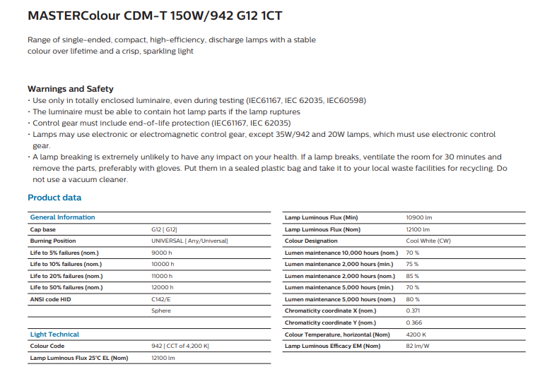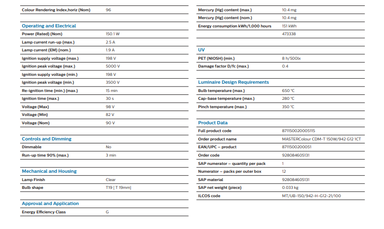 - Product Model: PHILIPS MASTER CDM-T 150W/942 G12 (Order Code: 928084605131)