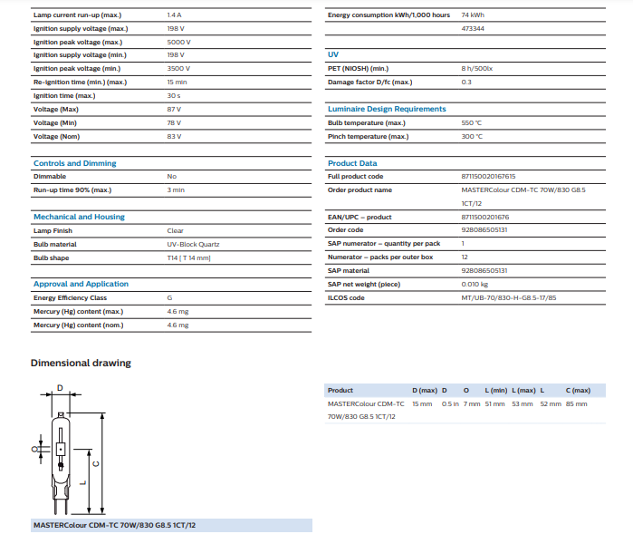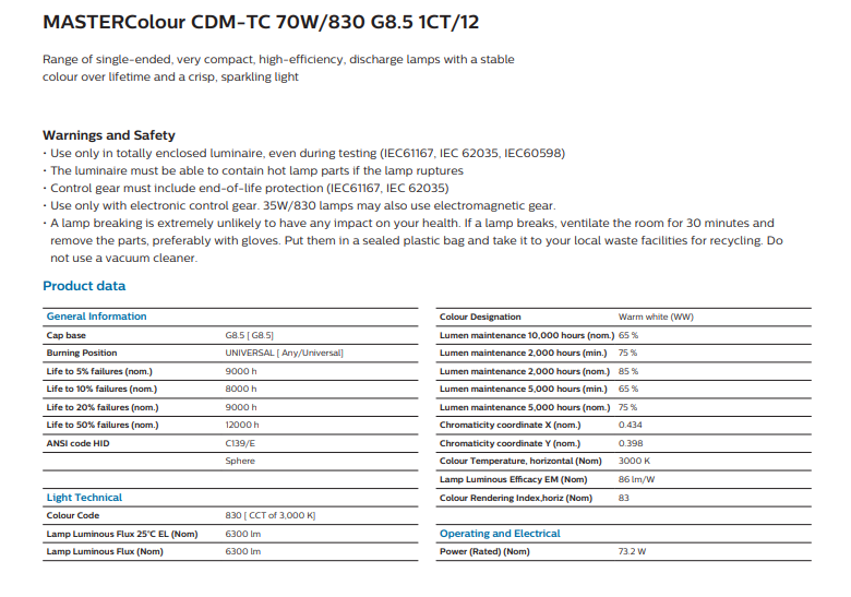 - Product Model: PHILIPS MASTERCOLOUR CDM-TC 70W/830 G8.5 (Order Code: 928086505131)