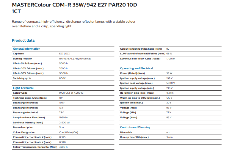 For a high-performance, energy-efficient, and precision-focused lighting solution, choose the PHILIPS MASTERCOLOUR CDM-R 35W/942 E27 PAR20 10D – designed to meet the needs of professionals seeking high-quality HID spotlighting.