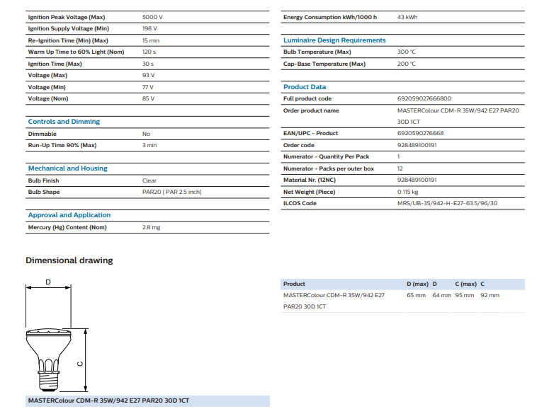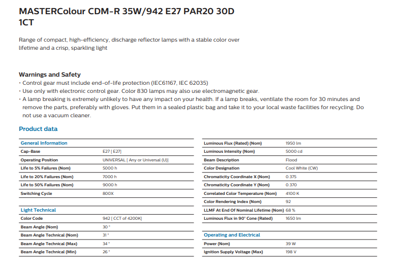 - Model Number: CDM-R 35W/942 E27 PAR20
