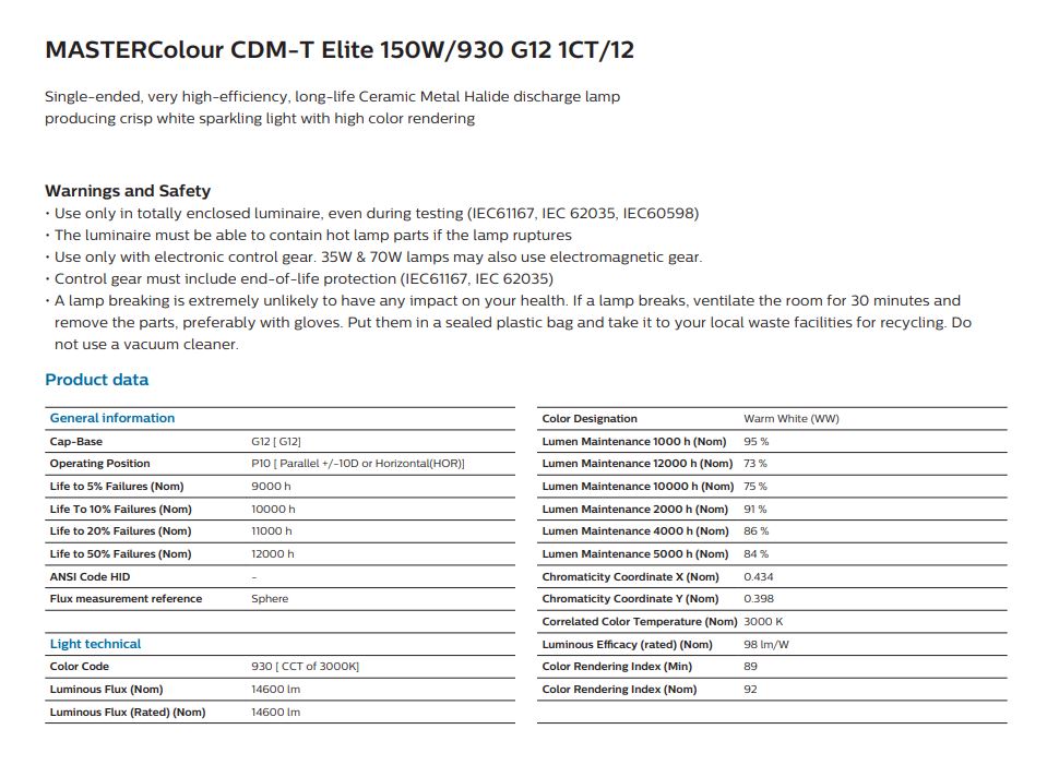 Upgrade to the PHILIPS MASTER CDM-T ELITE 150W/930 G12 3000K Warm White HID Bulb and experience exceptional lighting quality with energy efficiency and long-lasting performance!