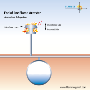 End-of-line deflagration flame arresters stops flame propagation at atmospheric explosion before flame enters into the storage tank.