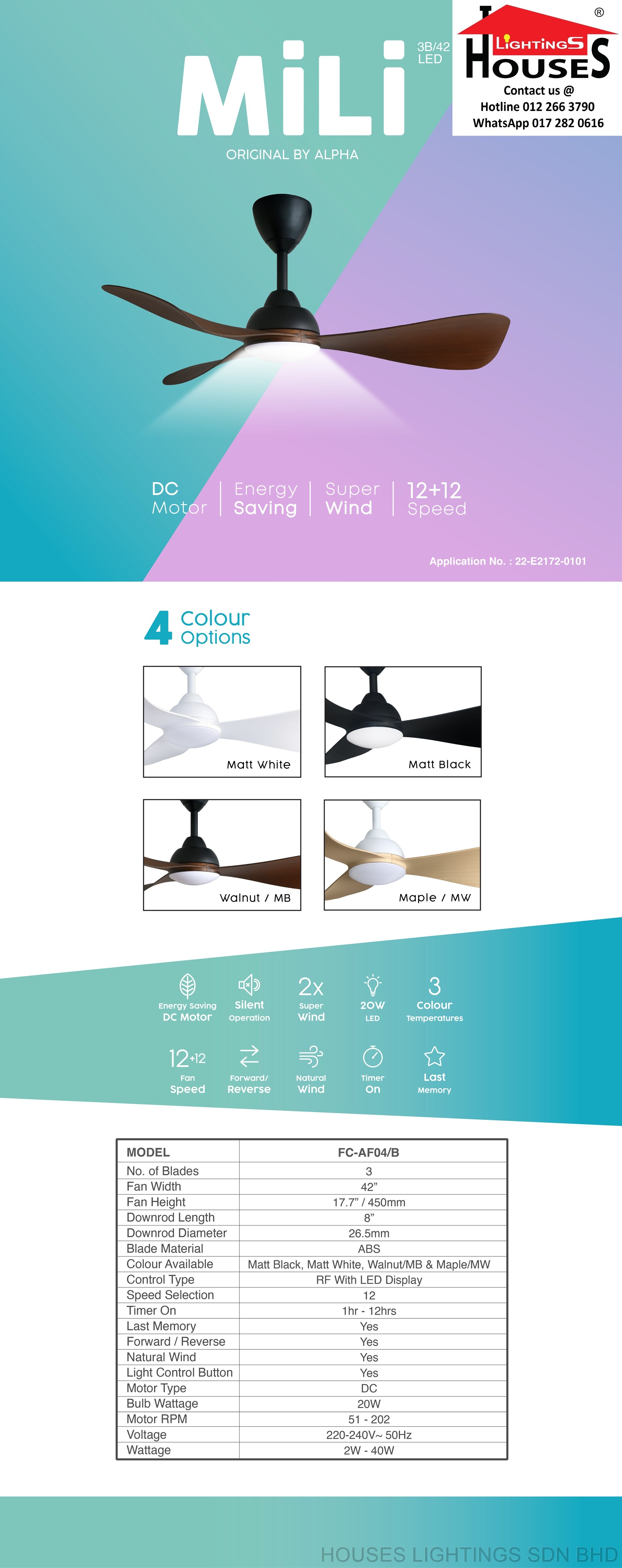 Selangor,Kuala Lumpur (KL),Puchong - ALPHA Alkova - Mili LED 3B 42 Inch DC Motor Ceiling Fan with 3 Blades (12 Speed Remote) - Walnut + Matt Black
