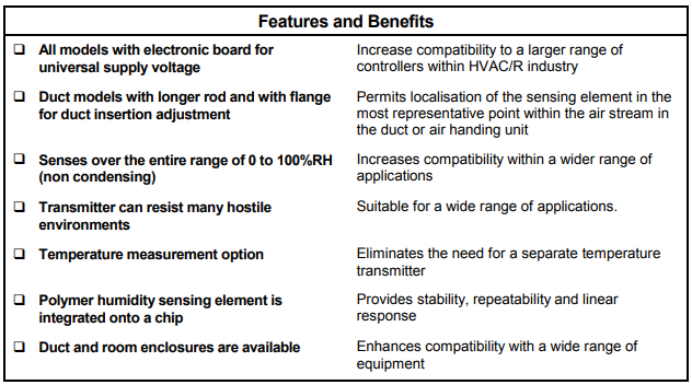 The basic principle of this new humidity transmitter is a polymer capacitance type element in which capacitance changes proportionally to a change in humidity. This well proven technology is now combined with the signal processing electronics onto a single chip. The sensing element incorporates a protective coating which resists the effects of surface contamination.