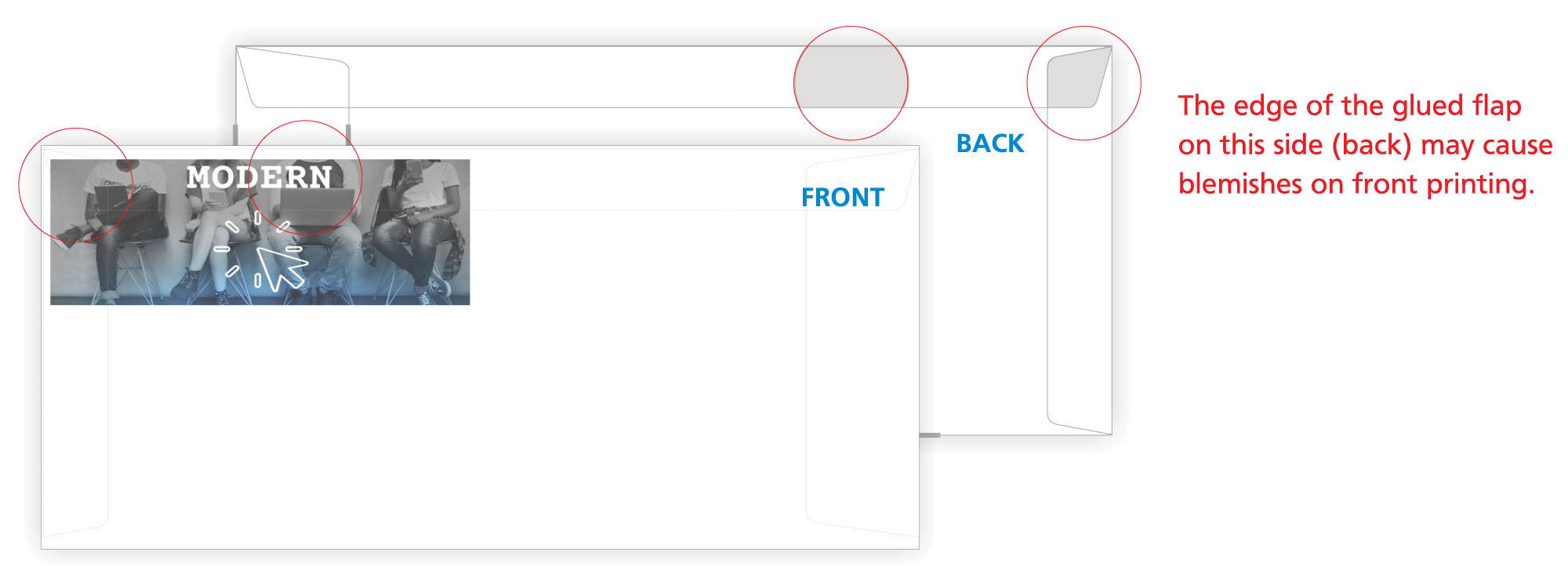 As all designs are offset printed over ready made envelopes, it is not advisable to print the front top portion with large images or in solid color as the edge of the glued flap on the opposite side (back) may cause blemishes. Hence customer shall notice this risk and we shall not be held responsible for blemishes.