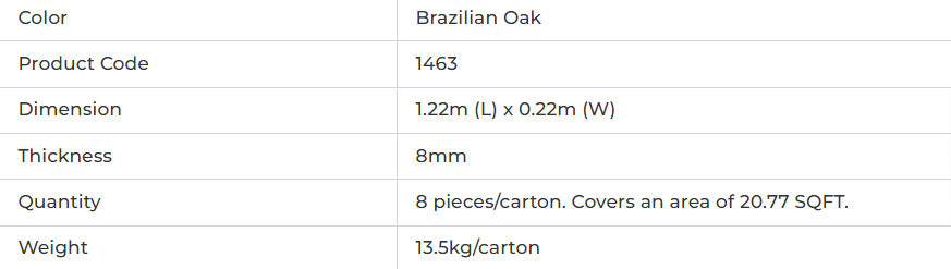 无论您是在打造一个温馨的乡村厨房,还是想要提升家中办公室的品味与格调,KayuPlus 的巴西橡木色(1463)深色木纹地板,都能为您的空间带来质感与温暖。深木色调营造出舒适的氛围,适合各种家具风格,深受广大消费者喜爱。MAN KIAN HARDWARE & TRADING SDN BHD 向市场供应这款时尚又实用的地板,帮助客户打造一个既舒适又独具魅力的家居环境。