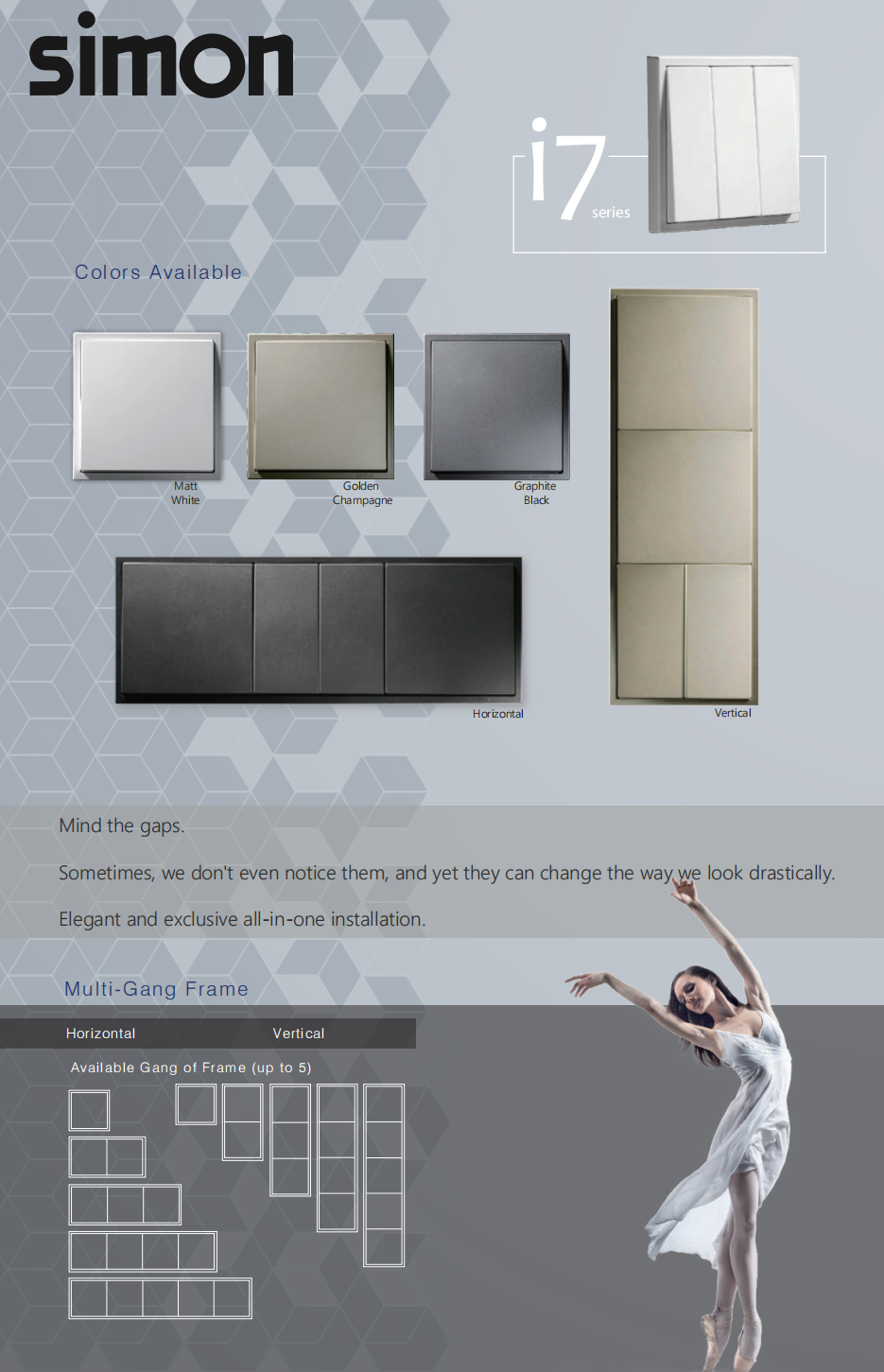 Product details of SIMON i7 SERIES SWITCHES MATT WHITE GOLDEN CHAMPAGNE GRAPHITE BLACK