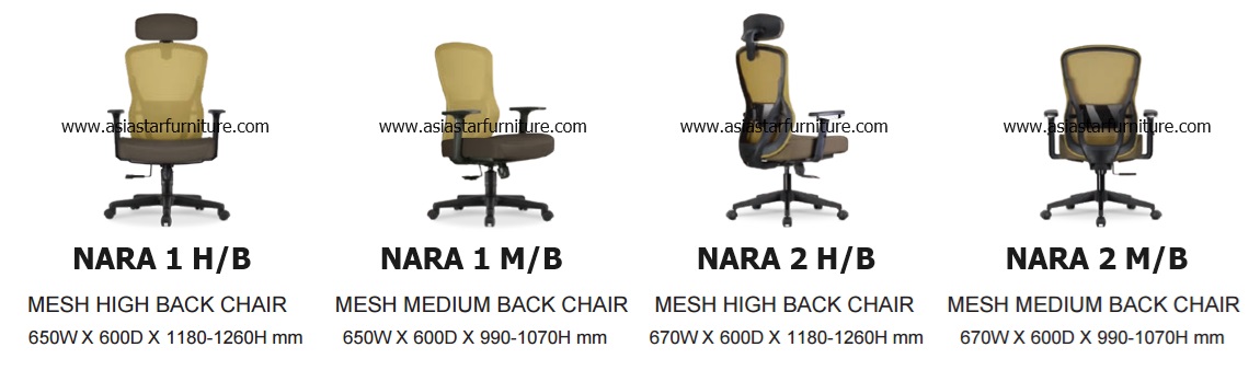 Description : Get the NARA Mesh Chair with High-Density Moulded Foam. NARA 2 features 2D Armrest. Breathable comfort for long hours. Class 4 Gas Lift. Buy from AsiaStar Furniture!