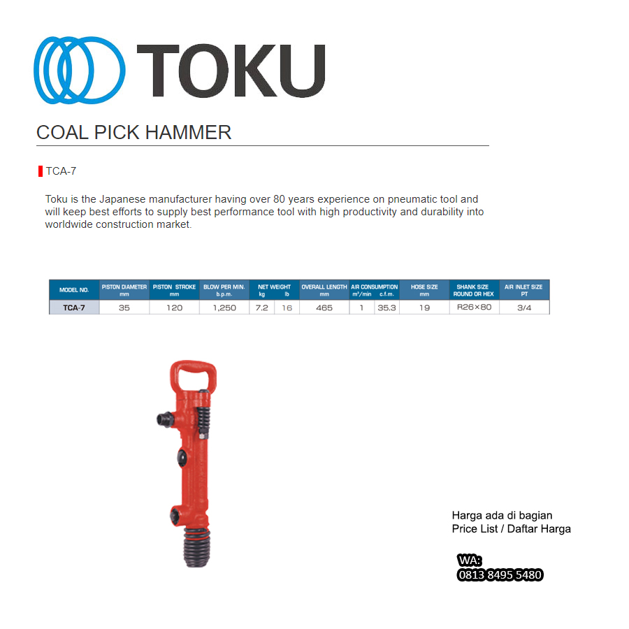 Toku TCA-7 (Made in Japan) is an air demolition hammer designed for general concrete breaker in construction worksites.