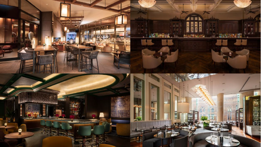 [Clockwise, top L-R: The Terrace, Conrad Singapore Marina Bay; Long Bar, Waldorf Astoria Shanghai on the Bund; Glass Brasserie, Hilton Sydney; and Canes & Tales, Waldorf Astoria Osaka]