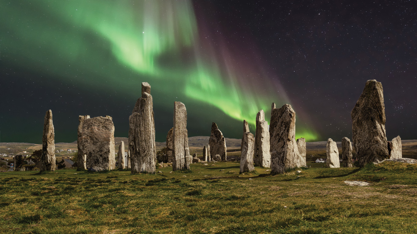 A scenic view of the famous holographic waves against the night sky at, Callanish, Scotland, United Kingdom