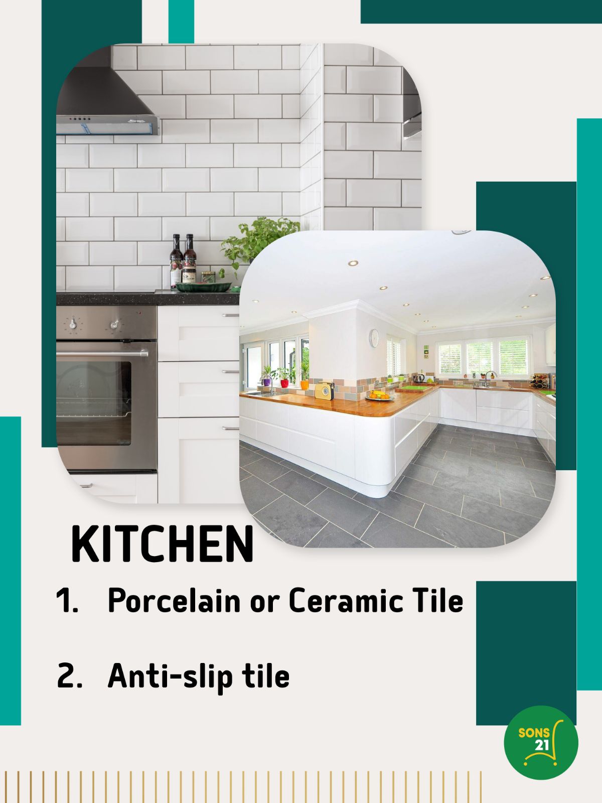 Porcelain, ceramic, or anti-slip tiles excel in kitchens due to stain resistance and easy cleaning amid spills and grease. These materials withstand heat and heavy use, maintaining a sleek look with matte finishes for safety.