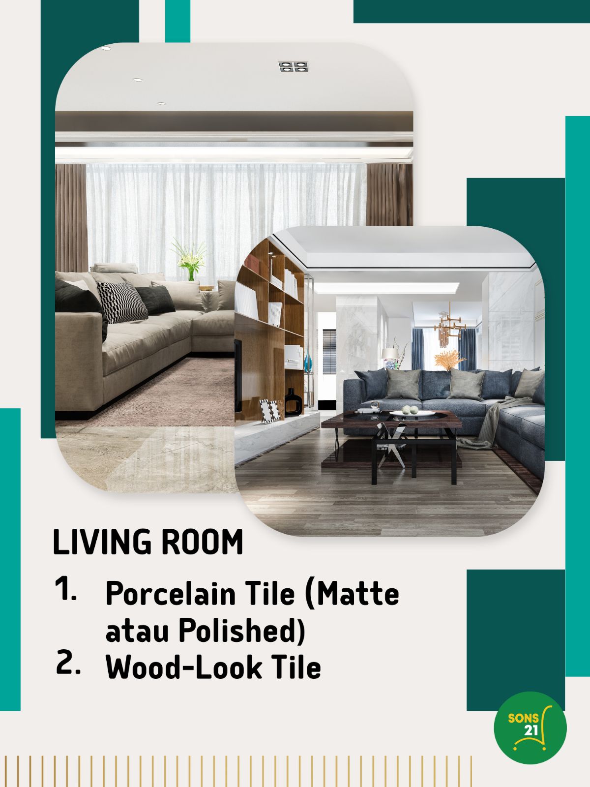 Porcelain in matte or polished finishes, or wood-look tiles, suits living rooms for durability under foot traffic and a warm, stylish vibe. Larger formats minimize grout lines, creating an expansive, modern flow.
