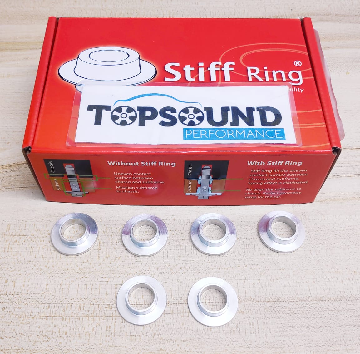 With the Stiff Ring in proper place, the gap is filled up to stop the movement of the sub frame and the car body forever and provide ideal alignment between both, as a result of a perfect geometry setup. Uneven surface is filled up by Stiff Ring, thus, spring effect is remove and resulting a comfortable cabin even further improved the car stability.