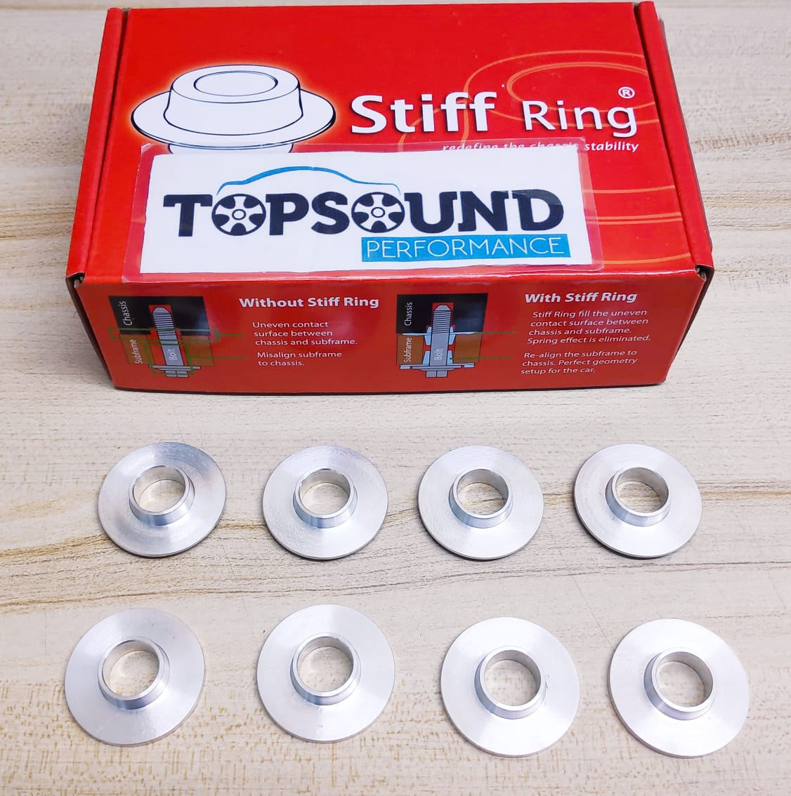With the Stiff Ring in proper place, the gap is filled up to stop the movement of the sub frame and the car body forever and provide ideal alignment between both, as a result of a perfect geometry setup. Uneven surface is filled up by Stiff Ring, thus, spring effect is remove and resulting a comfortable cabin even further improved the car stability.