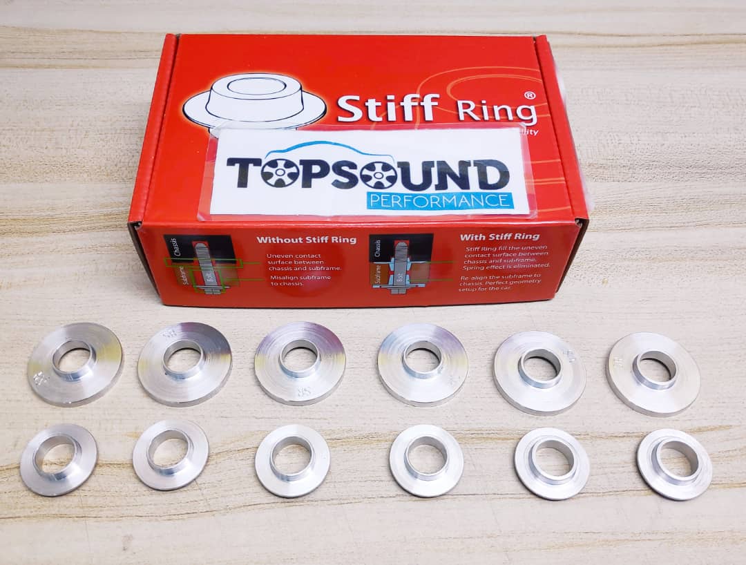 With the Stiff Ring in proper place, the gap is filled up to stop the movement of the sub frame and the car body forever and provide ideal alignment between both, as a result of a perfect geometry setup. Uneven surface is filled up by Stiff Ring, thus, spring effect is remove and resulting a comfortable cabin even further improved the car stability.