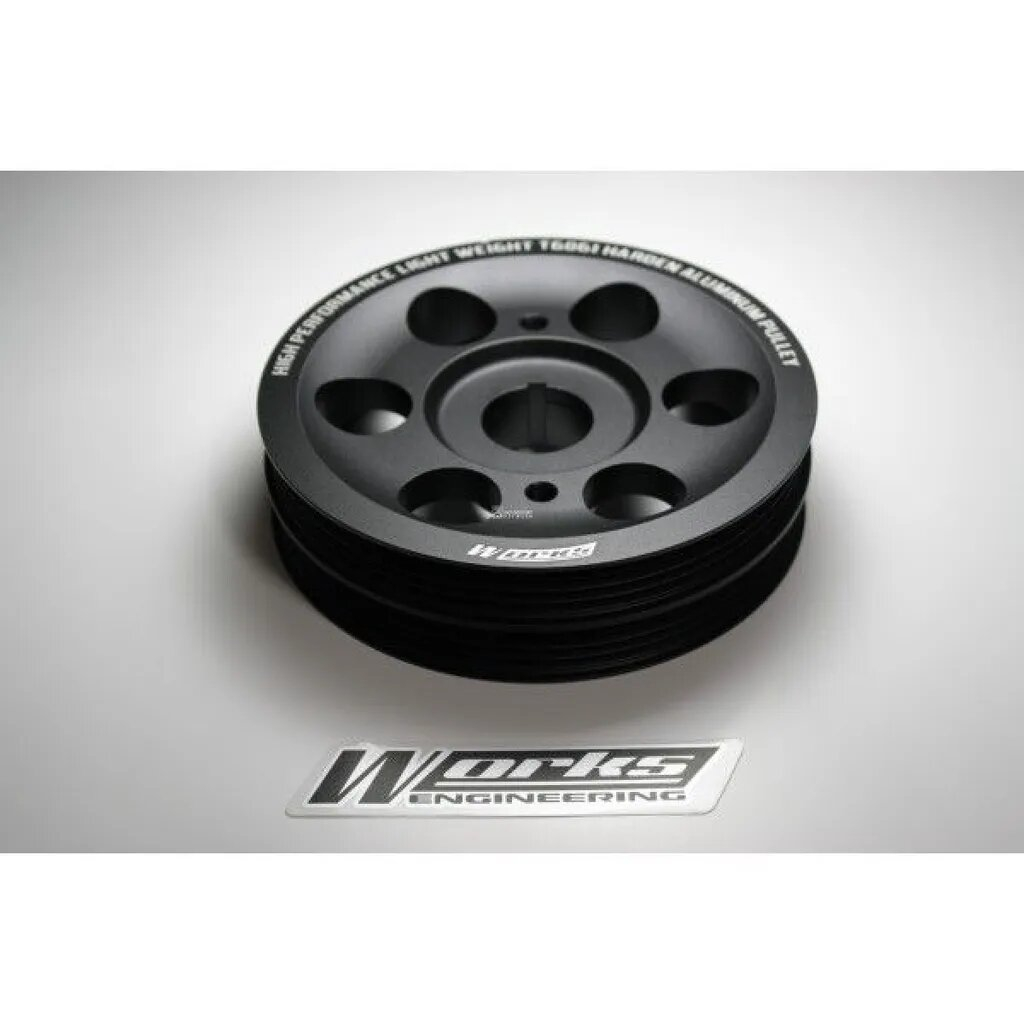 Weight reduction is how we are able to increase horsepower. Each pound of weight removed from the crankshaft is worth approximately 2.7HP, and our stock diameter crank pulleys are at least 60% lighter than the OEM pulleys they replace, our undersize crank pulley could be up to 90% lighter than the OEM pulleys. This weight loss provides even more spectacular gains than force induction, nitrous, VTEC and increased RPM’s. With our undersize crank pulley, we still fully maintain all accessory output minimums like air conditioning efficiency, power steering feel, and voltage even at idle with everything electrical on in the car. There are no adverse effects from using any of our pulley versions. Bolt them on and forget about them, then just follow your vehicles normal maintenance schedule. Works Engineering crank pulleys are precisioned CNC with the highest grade light weight forged aluminium. Our Pro Balancing series are black oxide coated and hardened for even more strength, you will never have to worry about unbalance or breakage due to material fatigue.