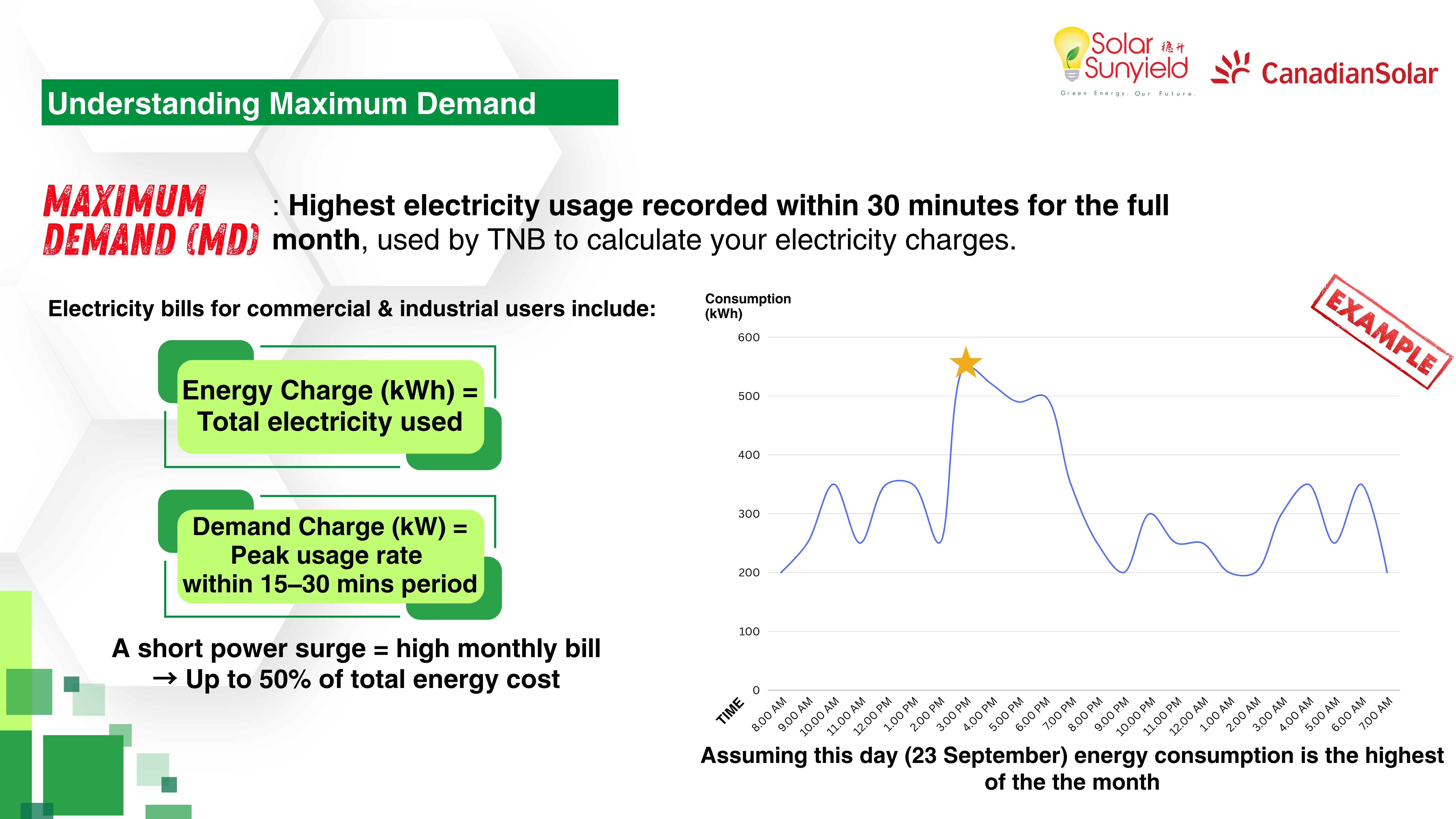 The result: Your total power draw from the grid is "shaved" down. You avoid setting a new peak demand record, and the MD charge for the month is contained.