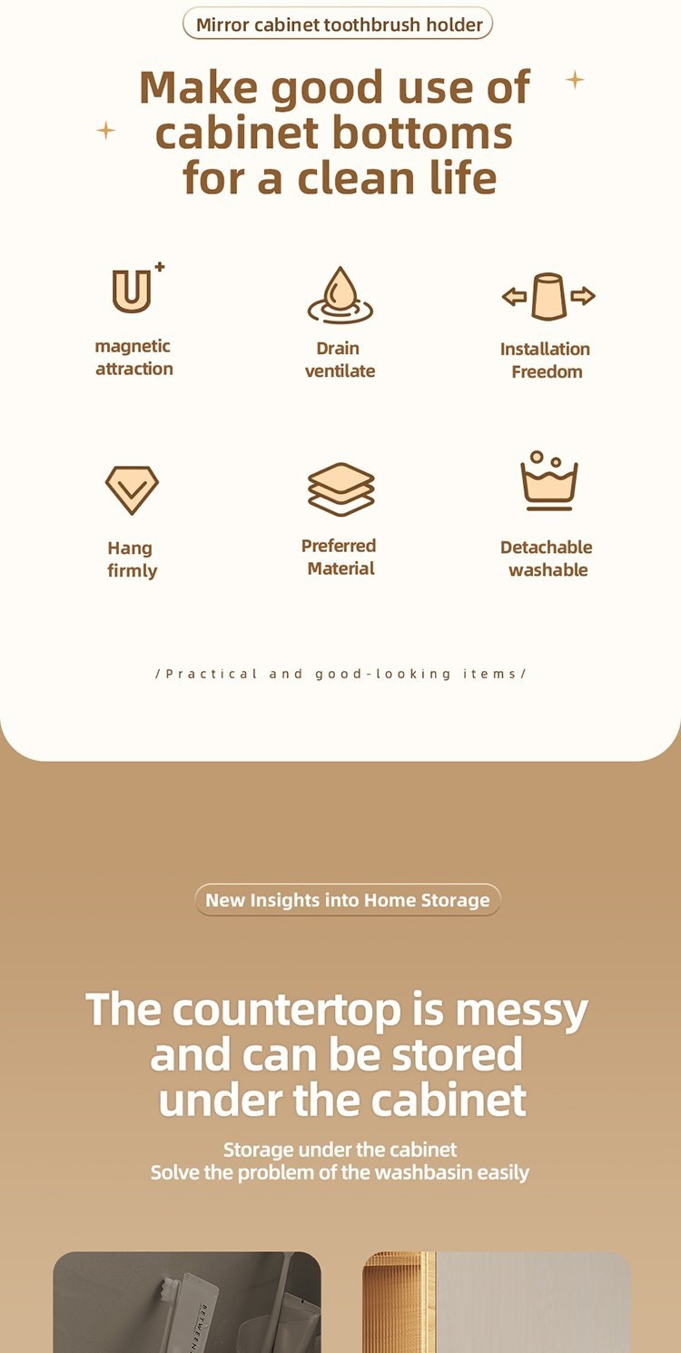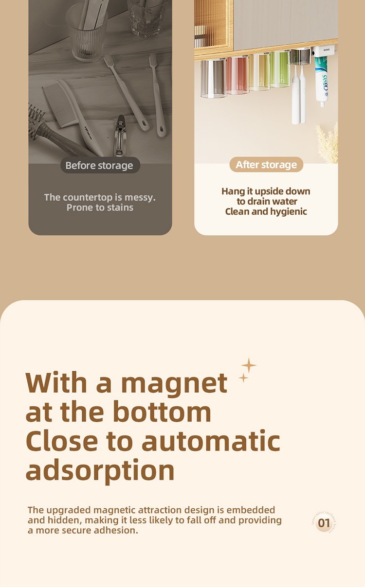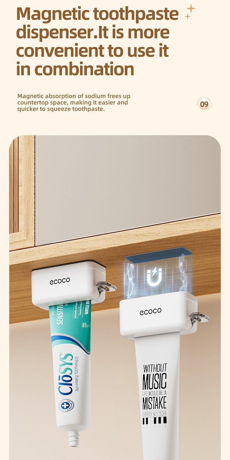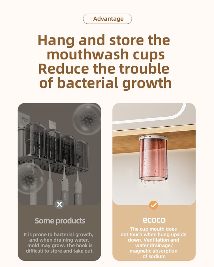 Upgrade your bathroom with this smart and hygienic ECOCO toothbrush holder. Designed with magnetic upside-down cups for fast drainage, strong load-bearing, and no-drill installation, making it perfect for any modern bathroom.