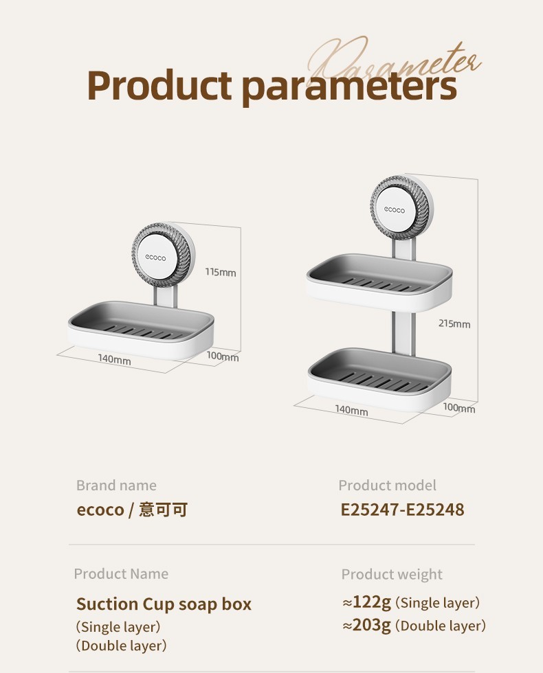 The ECOCO soap box uses upgraded press + twist suction that attaches firmly to smooth surfaces.