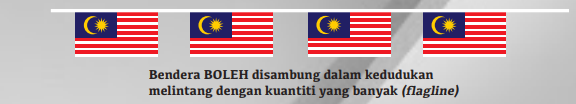 - Flag Banner (Bendera Jenis Gegantung) - Though commonly hung in public areas, an official Malaysia Merdeka flag banner is a unique addition to your National Day decorations. Display requirements-wise, the banner’s tail should be 1/8th of the total banner’s size, and it should always be hung with the crescent and star facing upwards, as demonstrated in Diagram 4.