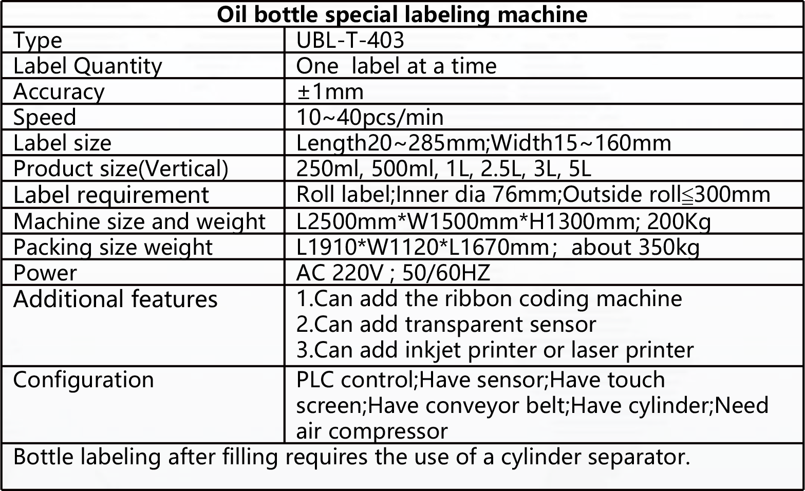 Function Introduction: Suitable for PET oil bottle labeling. Such as 250ml, 500ml, 1L, 2.5L, 3L, 5L oil bottles. With the handle can be positioned handle labeling.( 5L square bottle after filling, a label that wraps around three sides).