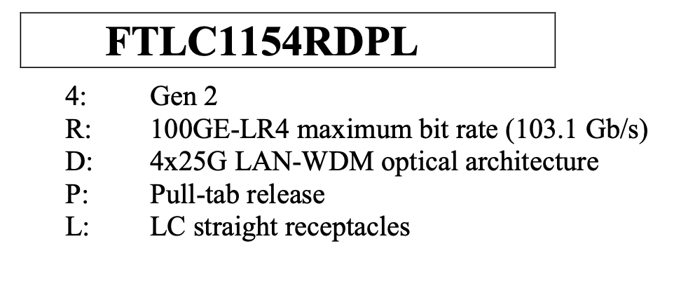 FTLC1154RDPL QSFP28 transceiver modules are designed for use in 100 Gigabit Ethernet links on up to 10km of single mode fiber.