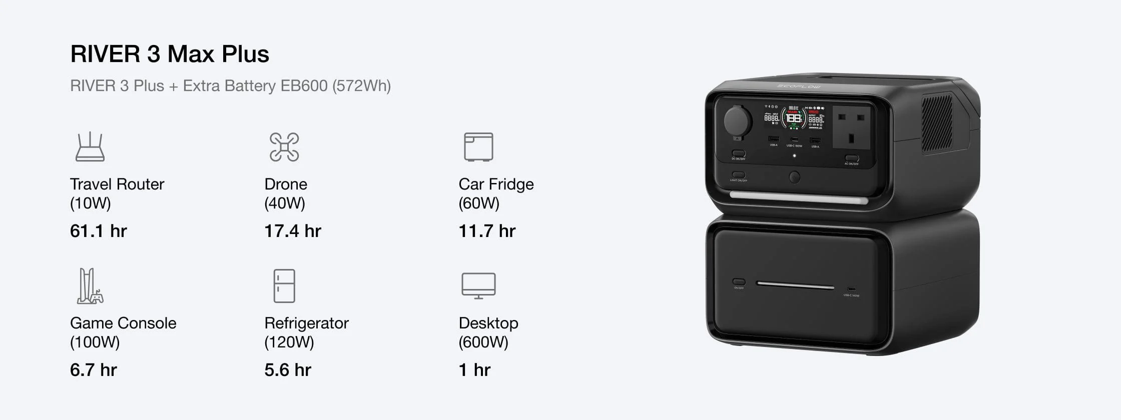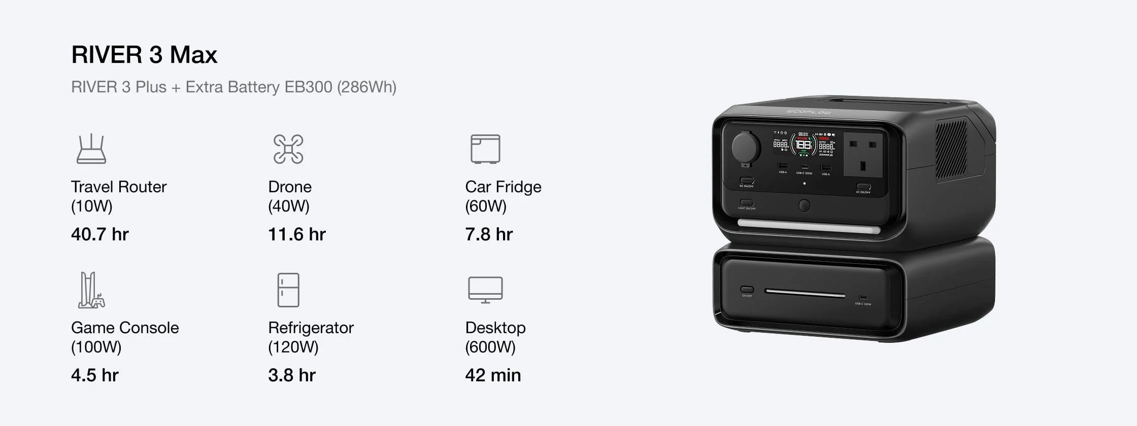 Level up your RIVER 3 Plus with an Extra Battery. Choose either the EB300 (286Wh) or the EB600 (572Wh), and simply stack one at a time to achieve up to 858Wh of pure energy.